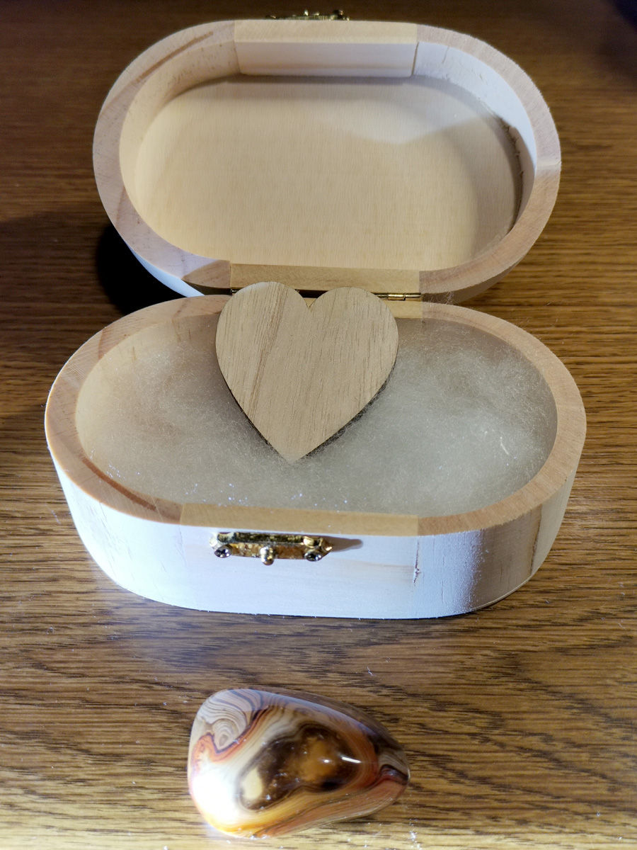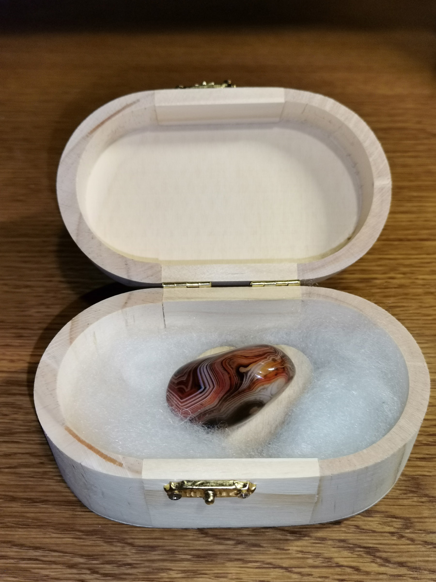 Kristal je v lepi naravni ovalni leseni škatli, ki prepušča energijo in omogoča, da kristal deluje neprekinjeno. Kristala ni potrebno nositi s seboj, saj energijo oddaja od kjerkoli. Uporablja ga lahko samo oseba, kateri je kristal namenjen, kar zagotavlja maksimalno energijsko povezavo in učinkovitost.